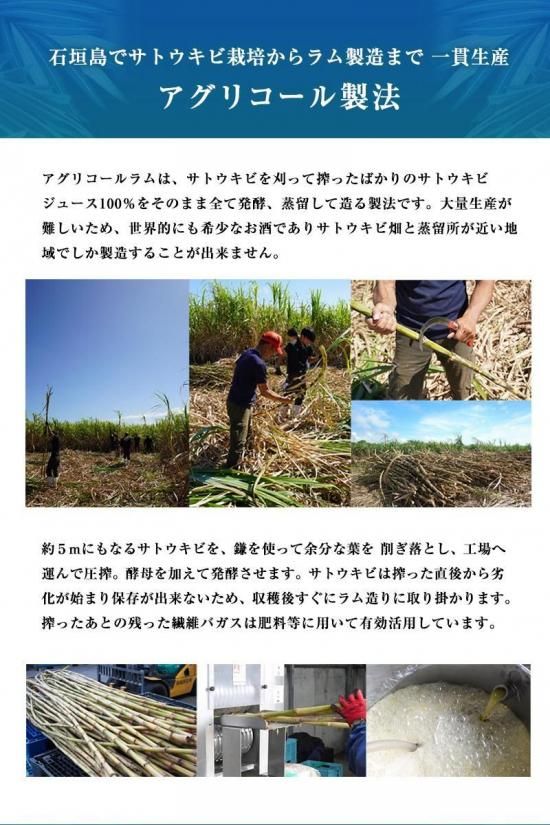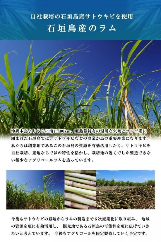 石垣島の豊かな大地と太陽の下で育ったサトウキビの搾り汁を(砂糖を造らずに)100%全て使用、樽熟成による品格のある薫りとバニラ香の中に、アグリコールならではのフレッシュで爽やかな香りも感じられ、柔らかく豊かな風味に仕上がっています。
